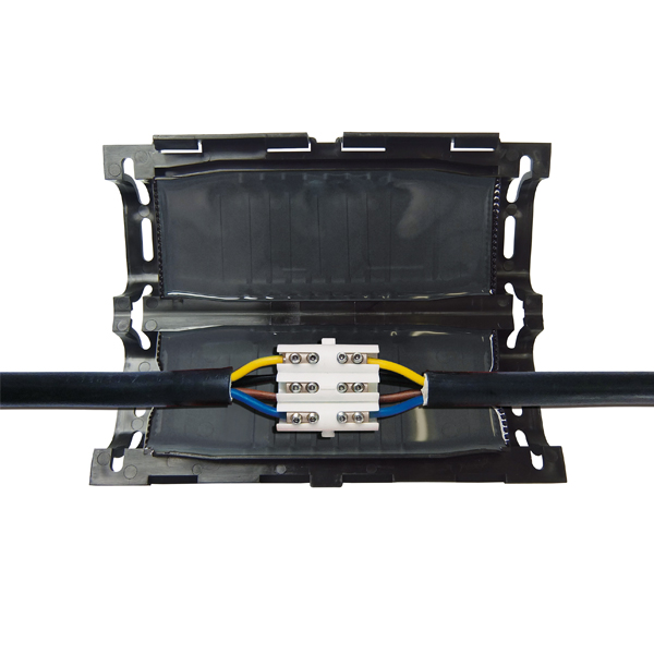 Gel-Verbindungsmuffe universell verwendbar zum Verbinden aller gängigen Kunststoffkabel und Leitungen (z. B. N(A)YY, NYM, H05) im Querschnittsbereich von 1.5 mm² bis 2.5 mm². Geeignet für Kupfer- und Aluminiumleiter. Anwendungsgebiete: Freiluft, Erdreich, Wasser (gemäß Prüfnorm), Innenraum (Verlegung in Gebäuden und auf Kabelpritschen). Eigenschaften: Verbinderbereich wird vollständig durch Gel abgedichtet, wieder zugänglich und sofort betriebsbereit, hochwertige, schlagfeste, flammhemmende Kunststoff-Formschale, UV-beständig, querschnittsübergreifender Verbinderblock, kennzeichnungsfrei und absolut ungiftig, schnelle und einfache Montage. Lieferumfang: Gel-Verbindungsmuffe, 3-Phasen-Klemme, Kabelbinder, Montageanleitung.