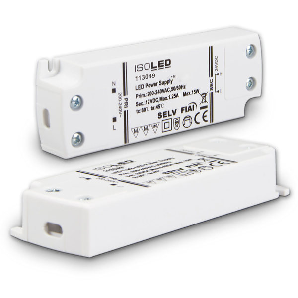 Ultraflacher LED Trafo 12V/DC mit 0-15W Leistung für Innenbereiche. Kurzschlussfest und SELV-konform