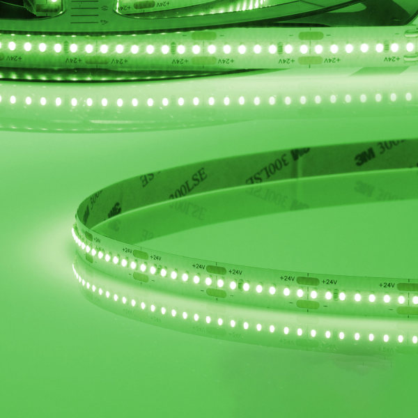 Flexibler LED-Streifen mit 280 LEDs/m in grün, 24V, 15W, IP20. Dimmbar via PWM mit fixem Abstrahlwinkel von 120° und 5-jähriger Garantiezeitraum
