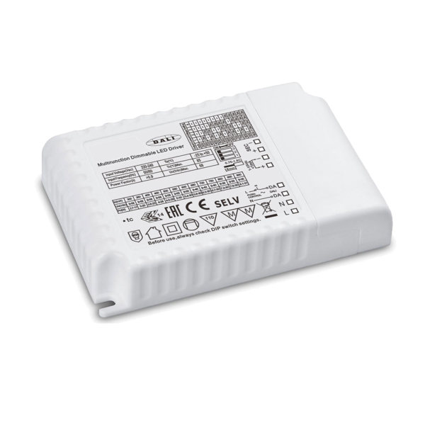 LED Konstantstrom Trafo für den Innenbereich mit Kurzschlussfestigkeit, 5 Jahren Garantie und Push/1-10V/DALI dimmbar. 300-900mA, 9-58V, 30W, SELV