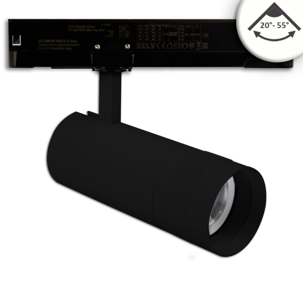 3-PH Schienen-Strahler fokussierbar, 24W, 20°-55°, schwarz matt, 4000K, dimmbar